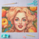 Éclairez n'importe quel espace avec cette scène estivale joyeuse. Une belle femme blonde sourit alors qu'elle se détend au milieu d'une abondance de pêches mûres et de feuilles verdoyants. Autour d'elle se trouvent des piles de fruits sucrés dans les tons coralliens, jaunes et rougis, nichés au milieu du feuillage. Les couleurs naturelles douces et la composition décontractée créent une sensation de chaleur et de détente.