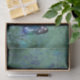 Papier de tissus avec un arrière - plan damassé en fausse feuille éblouissant aux accents vert et bleu et un papillon irisé.