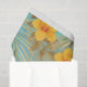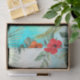 Elégant papier de découpage/tissu d'inspiration tropicale. Perroquet bleu perché au milieu de fleurs tropicales, feuilles sur fond bleu, jaune.