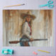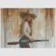L'image montre un tableau d'une cow-girl habillée en shérif. Elle porte un grand casquette à large bord avec couture décorative, une chemise à manches longues de couleur claire avec une poche sur la poitrine et un bandana rouge autour du cou. Elle a de longs cheveux ondulés qui coulent dans le dos. La cowgirl tient un fusil de chasse avec les deux mains et a une ceinture avec un holster autour de sa taille. L'arrière - plan de l'image présente un design texturé et abstrait avec des stries verticales de différentes nuances de marron et de beige. L'esthétique globale reflète la présence robuste et autoritaire d'un shérif occidental, combinée à la force et à la détermination d'une cowgirl. Shérif de fille avec fusil de chasse, casquette à large bord, couture décorative, chemise à manches longues de couleur claire, bandana rouge, ceinture de sécurité, arrière - plan abstrait, robuste et autoritaire esthétique occidentale.