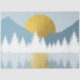 Un beau design mettant en valeur une forêt recouverte de neige, un paysage de montagne et un coucher ou lever de soleil doré se reflétant dans l'eau. Les tons de couleur sont neutres comme le bleu, le blanc et l'or. Un design rustique idéal pour la décoration d'une maison d'hiver et la saison des fêtes.