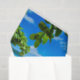 Papier de tissus avec une belle photo. Une plage de sable blanc à l'eau bleue azur. Image relaxante avec un ciel ensoleillé et un surf doux en mousse avec quelques mignons feuilles tropicaux encadrant l'image.