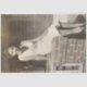 Une dame assise sur une corniche en brique, habillée d'une robe à motifs avec un col, des manches courtes et une taille ceinturée. Elle porte des chaussures à sangle de cheville et le ton monochromatique suggère qu’il s’agit d’une photo plus ancienne. Le cadre semble être un porche, ajoutant une atmosphère décontractée et accueillante à l'image. La tenue et la posture de la dame dégagent une élégance et une simplicité classiques.