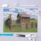 Une minuscule grange au toit rouge, seule dans un grand champ d'herbe, est partiellement fermée par une clôture de piquetage