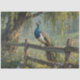 beautiful piebald peacock standing on a split rail fence in wildflowers