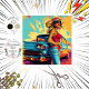 Illustration stylisée d'une personne debout à côté d'une voiture classique. La personne porte un casquette à large bord, un dessus rouge et un jean en denim. La voiture a des ailettes et des phares ronds proéminents, ce qui témoigne de la conception automobile américaine vintage. L'arrière - plan présente des éclaboussures abstraites de couleurs jaune, bleu et rouge, ajoutant une touche vibrante et artistique à la scène