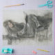 The digital artwork depicts a person sitting on a stone structure, possibly a grave or monument, with a cross in the background. The person is wearing a long, flowing dress and has long hair that appears to be blowing in the wind. They are holding an open book and seem to be reading it. The artwork is detailed, with intricate shading and line work that gives it a realistic yet ethereal quality. The cross in the background has some carvings on it, adding to the overall gothic and somber atmosphere of the piece. The face of the person is blurred or obscured, which adds a sense of mystery and anonymity to the figure. This image is interesting and relevant due to its emotional depth, artistic detail, and the evocative mood it creates.