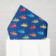 Papier tissulaire avec un motif de requins mignons, colorés, (en vert, rouge, jaune, orange et bleu) portant des chapeaux de Père Noël.
