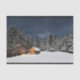 Cabine d'hiver rustique la nuit dans un paysage enneigé.
