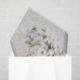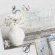 Bel design avec fleurs blanches dans un vase blanc avec éphémère vintage dans les tons bleu et gris.