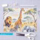 Journey into the wild heart of the African savanna with this vibrant safari adventure! Majestic lions with flowing golden manes, towering giraffes, striped zebras, powerful gray elephants, and other iconic wildlife stand proudly among acacia trees, golden grasslands, and warm sunset skies in soft orange, teal, and earthy tones.