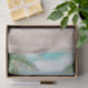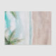 Scène de plage peinte à Island Breeze, avec des vagues océaniques, une plage de sable et des palmiers, sous un beau ciel bleu sarcelle. Une plage tropicale estivale, ou un papier de soie pour une conception de mariage à destination !