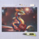 Serpent royal étoilé de l'univers. Une oeuvre numérique colorée : un serpent vibrant avec une couronne dorée, écailles irisées en rouge, bleu, jaune et blanc, orné de pivoines rouges. Le serpent porte une magnifique couronne dorée, soulignant sa présence royale et sa puissance. Ses écailles sont astucieusement dessinées dans une mosaïque de couleurs vives. En arrière - plan, un univers cosmique de planètes, d'étoiles et de nuages nébuleux - un fascinant mélange de nature et d'espace !