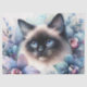This floral feline tissue paper features watercolor artwork of a blue-eyed Siamese cat surrounded by orchids in cool colors such as pastel blue and purple. The beautiful kitty is staring off to the side while posed among the exotic flowers.