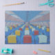 Ce dessin présente un tableau de l'artiste chilien Gregorio Undurraga. Il montre l'intérieur d'un avion. Les couleurs sont vives : les sièges dans l'avion sont bleus, les casiers au-dessus sont roses et les têtes alternent en jaune, blanc et rouge.