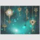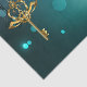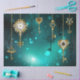 Or, clés antiques avec engrenages et cadrans accrochés sur chaînes dorées sur arrière - plan vert lumineux.