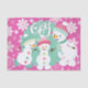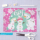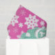 Papier de tissus de vacances au design fantaisiste et coloré avec un rose chaud avec des arrière - plans de flocons de neige blancs, une circulaire bleu aqua avec des petits pois blancs, et trois adorables bonhommes de neige avec des casquettes et écharpes d'hiver roses et bleus et un texte blanc qui dit Joy!
