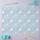 Arrière - plan bleu pastel avec bonhomme de neige, neige, sainte, neige endormie avec casquettes rouges, oiseaux avec casquettes rayés et bouffées d'oreilles, lunes avec coeurs pendants, et arcs mignons.