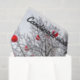 Papier-cadeau avec l'image d'un cardinal rouge dans un arbre enneigé avec des boules rouges et une citation des Cardinaux qui vous rendent visite quand les anges sont proches.