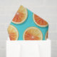 Un motif de tranches d'orange frais et juteux dans des teintes profondes de mandarine orange et rouge, avec une texture aquarelle pour lui donner ce look fraîchement coupé. Elles sont placées sur un arrière - plan bleu vif pour un look lumineux et estival.