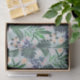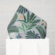 Summer tropical leaves and flowers botanical painting, filled with green, mint, teal, blue, blush, pink, yellow and white colors exotic plants pattern, unique faded leaf shapes and flowers jungle greenery pattern, on a light powder blue color background. A stylish and trendy earth rainforest illustration, earth tones tropical design, perfect for a summer botanic nature look decor.
