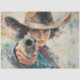 L'image est une photo peinte représentant une femme shérif pointant une arme sur un voleur de banque. Le shérif est habillé de vêtements occidentaux traditionnels, dont un casquette à large bord, un manteau long, un gilet et une ceinture avec un holster. Sa position est confiante et affirmée, avec un regard déterminé sur son visage. L'arrière - plan dispose d'un paysage sauvage et désertique avec des montagnes et un ciel nuageux, ajoutant à l'atmosphère dramatique et intense de la scène. L'utilisation de touches audacieuses et de couleurs vives améliore l'impact global de l'image, ce qui la rend à la fois frappante et évocatrice. Shérif femme photo peint, braqueur de pistolets, vêtements occidentaux, casquette à large bord, manteau long, paysage désertique accidenté, dramatique et intense, coups de pinceau audacieux, couleurs vives