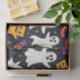 Préparez-vous à envelopper vos cadeaux dans la magie d'Halloween pure avec ce papier de tissu ludique. Le design est composé d'un arrière - plan noir profond, d'une toile pour un adorable casting de fantômes amicaux et de joyeuses lanternes jack-o'. Chaque fantôme, avec son expression joyeuse et aux yeux larges, flotte aux côtés de citrouilles brillants, de chauves-souris espiègles et d'étoiles dispersées dans des éclats éclatants de violet et d'orange. Ce design festif et amusant est la touche finale parfaite pour tout cadeau d'Halloween.
