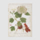 Vintage botanical illustration of a white hydrangea flower in summer and autumn with white flowers and red berries and foliage. Vintage French script in the background. Great for decoupage or crafts.