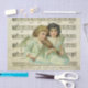 Illustration vintage image religieuse de Noël avec deux anges ; l'antique Victorian die découpé sur des partitions. Un ange joue d'un instrument de musique à cordes, le violon, et l'autre ange musicien tient des partitions. Laissez ce beau design angélique vous aider à célébrer les fêtes de cette saison.