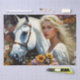 Introducing a captivating artwork featuring the serene beauty of a White Horse and it's beautiful blonde riding partner, now available for purchase! This exquisite composition celebrates the majestic allure of the white horse, capturing its grace and strength in a visually striking display.