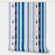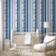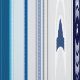 Diseño en color blanco con líneas verticales en tonos azules y brocado abstracto.