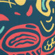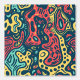 Cette oeuvre présente un motif abstrait dynamique et énergique rempli de formes fluides et organiques et de couleurs audacieuses et contrastées. La composition est dominée par des formes tourbillonnantes en rouge, jaune, turquoise et bleu foncé, créant un sentiment de mouvement et de dynamisme. Les détails complexes et les lignes variées confèrent à la pièce une qualité ludique, presque hypnotique, qui rappelle les années 60 et les années 70 art psychédélique. Le design est à la fois chaotique et harmonieux, attirant le spectateur dans son monde complexe et immersif.