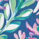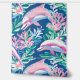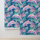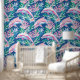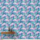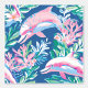 Un motif sans soudure avec des dauphins blancs et roses nageant dans une mer bleue remplie de plantes marins roses et bleus. Le design capture une scène sous-marine fantasque et vibrante avec des dauphins ludiques et une flore aquatique colorée.