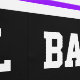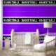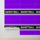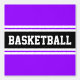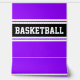 Ce design sportif amusant présente du texte athlétique BASKETBALL à l'intérieur d'une bande horizontale noire centrale, accompagnée de deux bandes blanches de course contre des bandes de bord extérieures violettes.