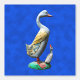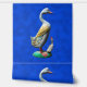 Un canard en bois peint et sculpté avec son canard, lourdement patiné, sur un arrière - plan bleu.