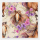 Aquarelle cheval courant avec belle crinière et queue fluide et fleurs roses et violettes.