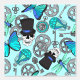 Crânes à vapeur papier peint à motifs avec crânes portant chapeaux, cogs, engrenages, papillons, libellules et ballons d'air chaud dans les tons bleu et gris