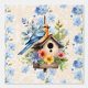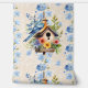 Oiseau d'aquarelle assis sur une maison à oiseaux fleurie sur un arrière - plan bleu rayé à la crème texturée.