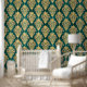 Un beau motif damassé d'inspiration victorienne classique avec une touche moderne en faux or et vert foncé.