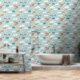 Parfait pour une petite crèche ou une chambre pour garçons, ce papier peint présente des images répétées d'avions à hélice, de nuages et d'étoiles. Les couleurs dominantes sont le rouille orange, le jaune, le blanc et le bleu sur un arrière - plan bleu pâle. Mignonne !