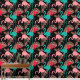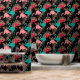 Motif colorée avec flamants roses et bleus entourée de plantes tropicaux contre arrière - plan noir.