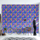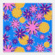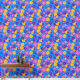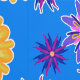 Fleurs roses et violettes et jaunes fantaisistes avec contour blanc sur bleu.