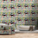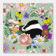 Un mignon blaireau noir et blanc assis au milieu des fleurs et des champignons sauvages en arrière-plan vert sauge