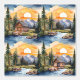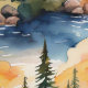 Aquarelle cabine dans la forêt boisée avec des pins à fourrure, ruisseau, montagnes et papier peint couché de soleil.