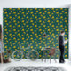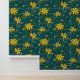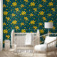 Wallpaper with flowering St. John's Wort pattern. Big yellow flowers, with buds, leaves and stems, are printed in a seamless, repeating pattern over a very dark teal blue color.