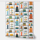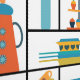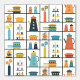 Élégante, minimaliste, graphique, étagères de cuisine moderne du milieu du siècle, avec tasses, cafetière, cafetières et thé, plats de cuisson, casseroles et cupcakes. Faites-moi savoir si vous voulez une échelle différente pour le motif. J’aimerais voir mon design dans le monde - étiquetez-moi sur IG @parry_vegan.
