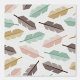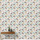 This pattern features a playful arrangement of retro-inspired feathers in pastel colors against a light grey, hand-drawn striped background.