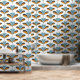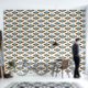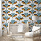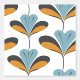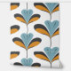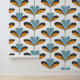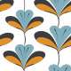 Papier peint d'inspiration rétro aux formes florales géométriques audacieuses en bleu, orange et crème contre un arrière - plan noir. Parfait pour les intérieurs modernes du milieu du siècle, les murs avec accent, ou les projets de tissu de déclaration avec une ambiance vintage les années 70.