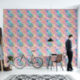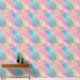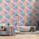 Cette tapisserie présente des tourbillons de couleurs pastel dans les tons rose turquoise, orange et jaune, aux accents dorés paradisiaques.