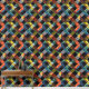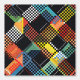 Cette oeuvre présente un motif de mosaïque dynamique et coloré composé de carrés et de rectangles pixelisés en forme de damier. Le design est un mélange vibrant de couleurs, dont les rouges, les jaunes, les bleus et les verts, dressé contre un arrière - plan noir foncé. Les éléments pixélisés se chevauchent et se croisent, créant un sens de profondeur et de mouvement dans la composition. La combinaison de formes géométriques et de couleurs vives, ainsi que l'effet de pixelisation numérique, donne à l'oeuvre une esthétique moderne d'inspiration technologique tout en ressemblant à un motif de courtepointe traditionnel.